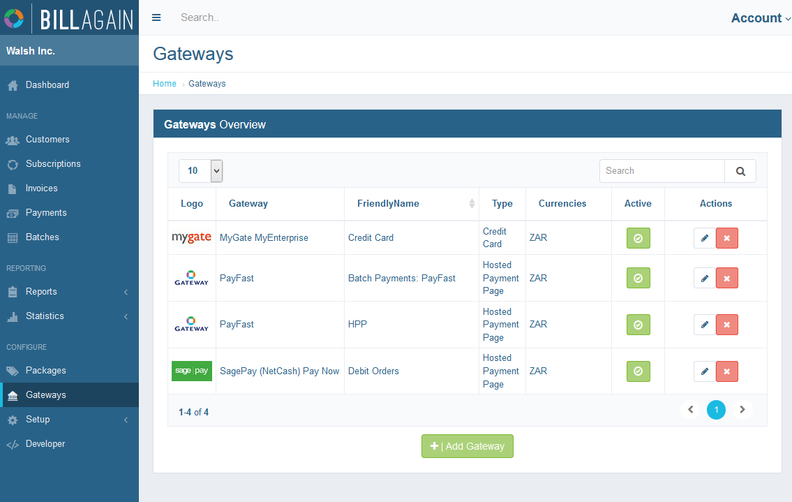 This area of Bill Again is accessed by way of the left-hand main menu, specifically by clicking Gateways. This brings the user to a table formatted list of all the Gateways currently registered to your account, as shown below: