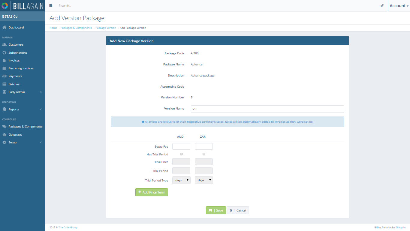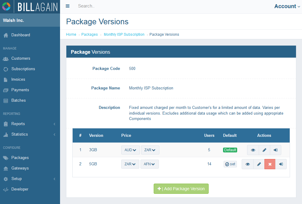 Bill Again allows you to create and manage different Versions of Packages and Components. This allows you a flexible platform from which Packages and Components with specific terms can be assigned to specific Customers as needed. Different versions of a Package or Component can differ between each other by their pricing and supported terms. There is no limit on the number of Versions a Component or Package may have.